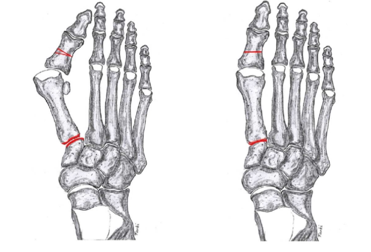 abweichen. Hierbei kann sich die Grosszehe in extremen Fällen über oder unter